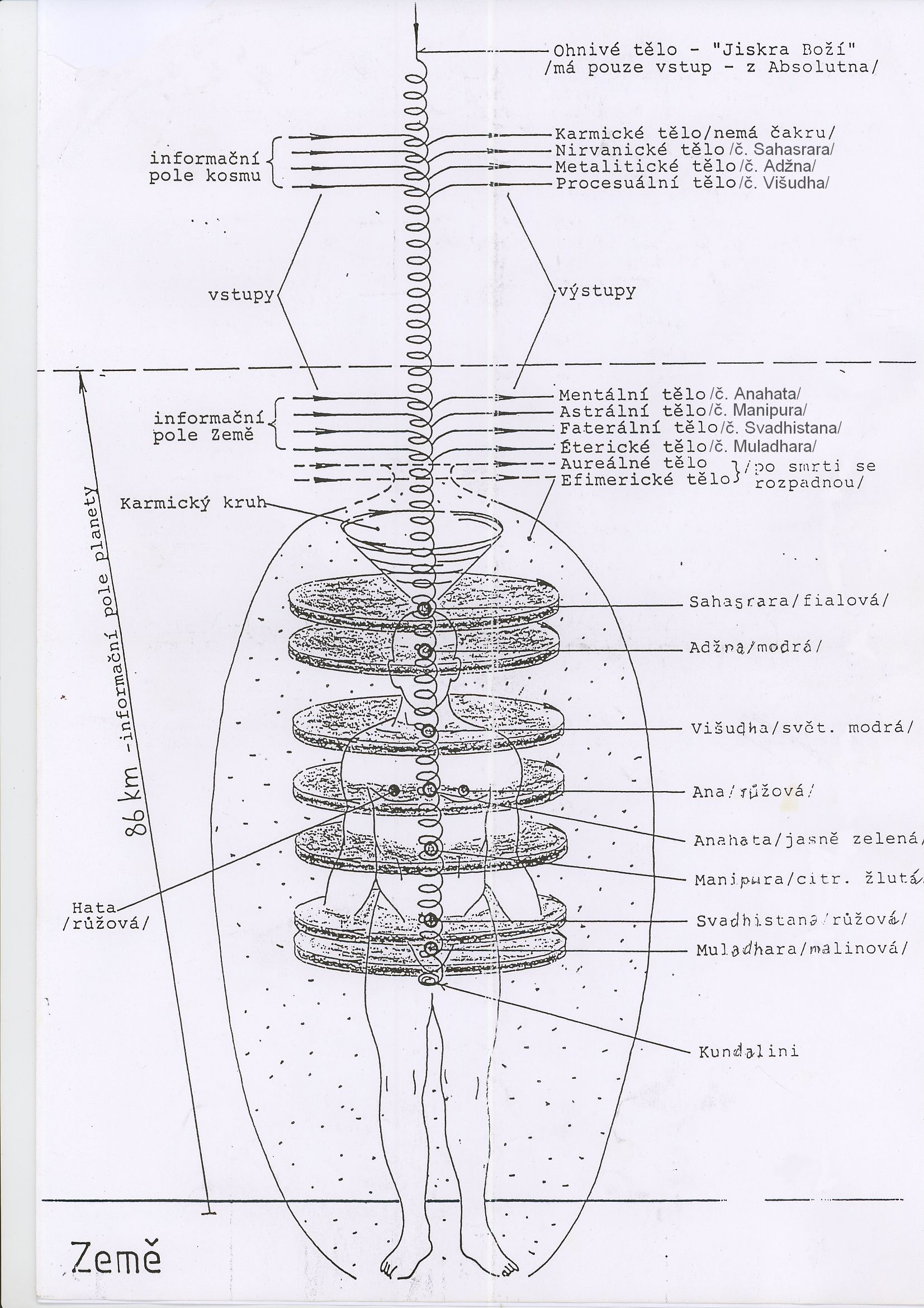 Zhrnutie: Spravidla sú telá vytvorené tak, že sa upevňujú na čakrách, na týchto slniečkach. Existujú však telá, ktoré nemajú svoju čakru. Je to ohnivé telo, ktoré však tieto slniečka tvorí, potom karmické telo a tiež aureálne a efemerické telo. Ani fyzické telo nemá svoju čakru. Ostatné telá majú podobnú stavbu, to znamená, že sa upevňujú každé na jednu čakru.